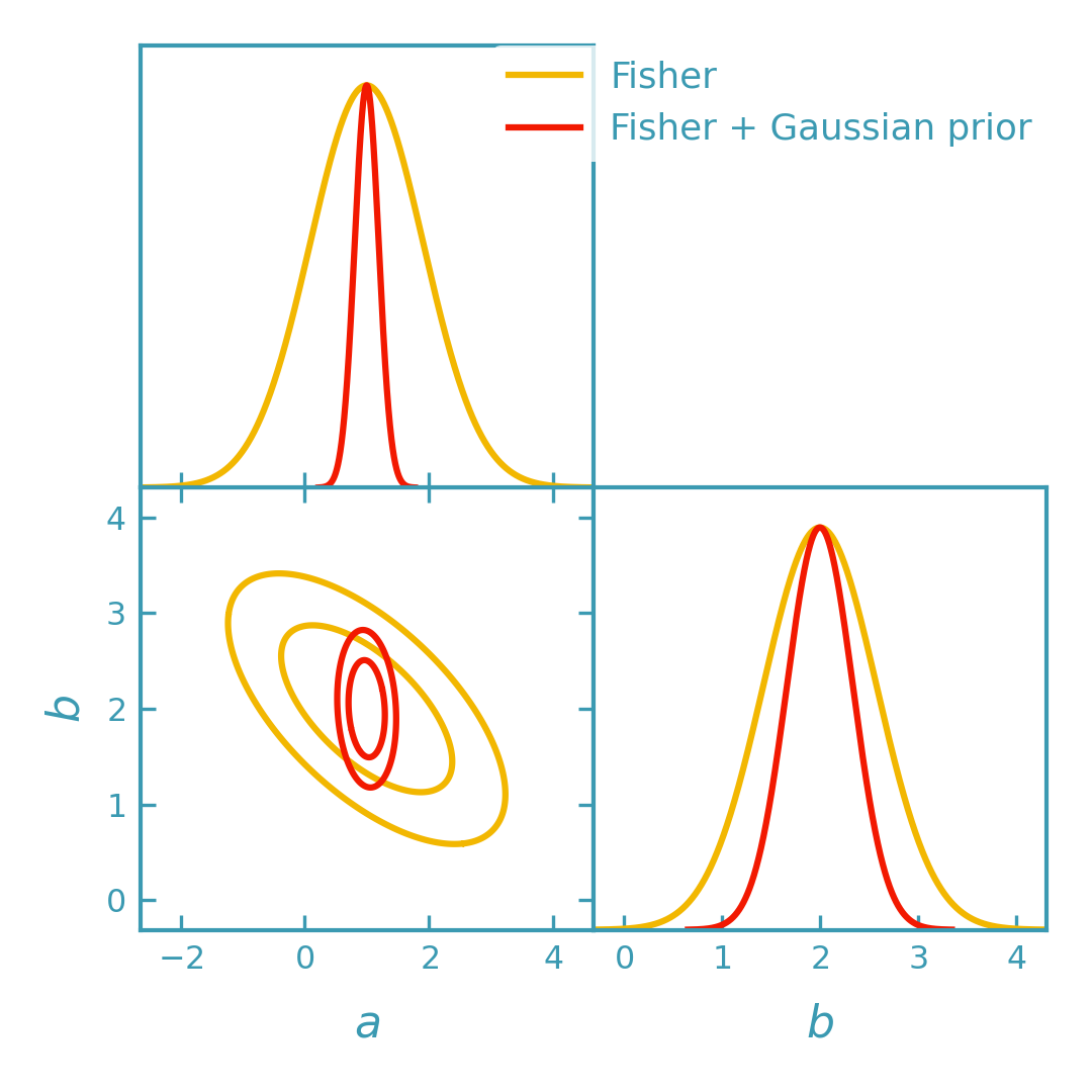 Gaussian priors can be included by adding their precision matrix (the inverse prior covariance) to the Fisher matrix before converting to GetDist objects. Below we overlay the original Fisher contours (red) with the Fisher+prior contours (yellow).