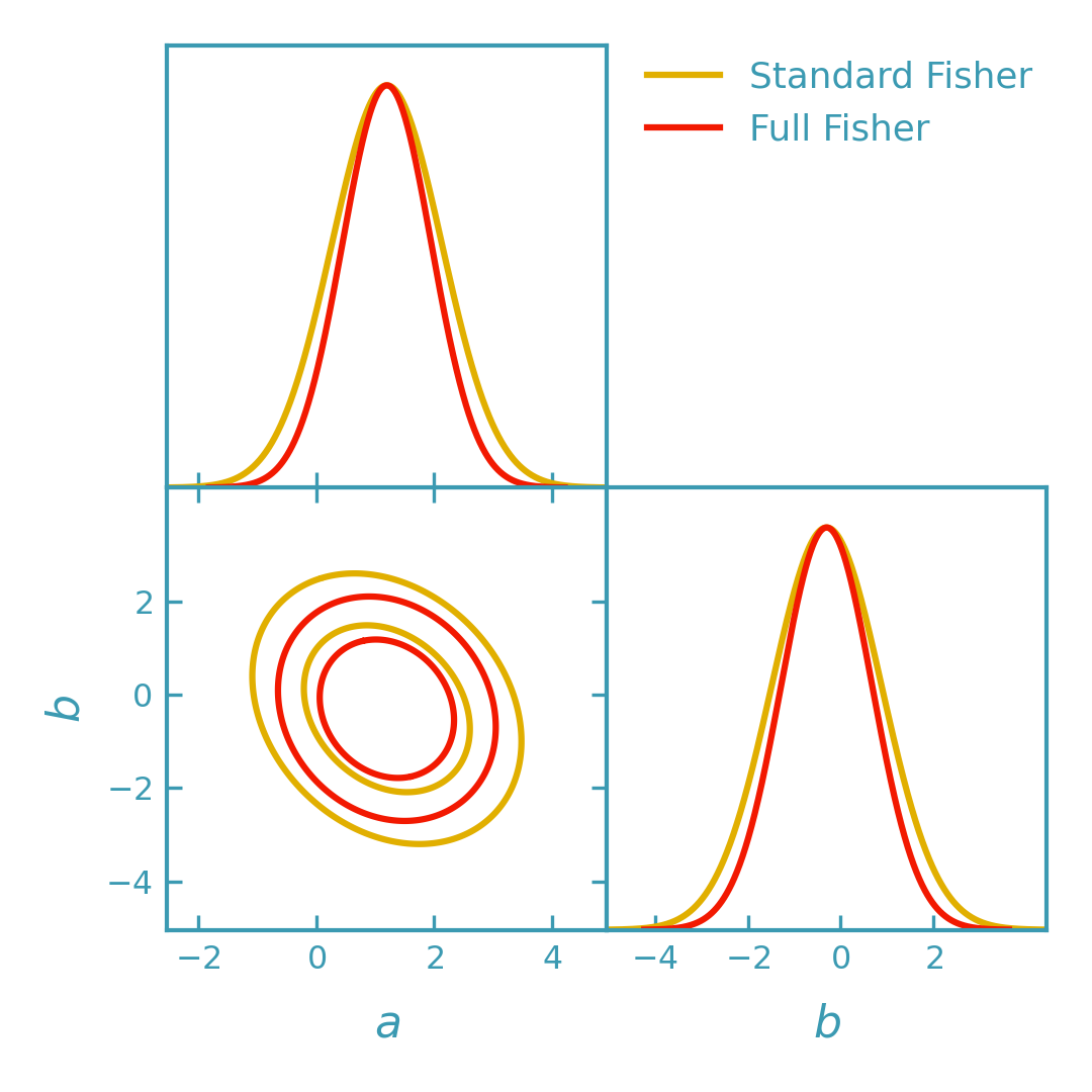 Full Gaussian Fisher: allows \(C(\theta)\) and adds the corresponding covariance-derivative terms to the Fisher matrix.